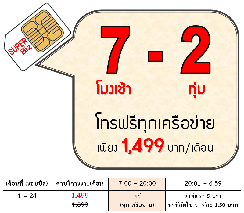 1. สงวนสิทธิ์เฉพาะลูกค้าองค์กร และนิติบุคคลเท่านั้น 2. รับสิทธิ์นาน 24 รอบบิล 3. สิทธิ์โทรฟรีทุกเครือข่าย โทรได้ไม่จำกัด สามารถโทรได้สูงสุดครั้งละไม่เกิน 1 ชั่วโมง ไม่จำกัดจำนวนครั้ง วันจันทร์ - วันศุกร์ ช่วงเวลา 06:00 - 18:00 น. (12 ชั่วโมง) และ วันเสาร์ - วันอาทิตย์ ทั้งวัน (24 ชั่วโมง) 4. โทรนอกช่วงเวลา วันจันทร์ - วันศุกร์ 18:01 - 05:59 น. ทุกเครือข่าย คิดค่าบริการนาทีแรก 5 บาท นาทีถัดไป นาทีละ 1.50 บาท 5. อัตราค่าบริการที่กำหนด เป็นอัตราที่ไม่รวมภาษีมูลค่าเพิ่ม และได้รับสิทธิโทรฟรีเฉพาะการโทรปกติภายในประเทศเท่านั้น ไม่รวมการโทรทางไกลต่างประเทศ และบริการเสริมอื่นๆ 6. ลูกค้าจะต้องจดทะเบียน, ชำระค่าบริการ และแจ้งยกเลิกการใช้บริการกับ ทางบริษัท พี. โอ. เอส. เลเลคอม จำกัด เท่านั้น 7. ในวันจดทะเบียน, ลูกค้าจะต้องชำระเงินประกันการใช้บริการเลขหมายจำนวน 2 รอบบิล (2,798 บาท) และทางบริษัทฯ จะคืนเงินประกันให้ลูกค้า หลังจากลูกค้าเลิกใช้บริการ และได้ชำระเงินค่าใช้บริการรายเดือนครบถ้วนแล้ว *** กรณีลูกค้าเปิดใช้งานไม่ครบกำหนด 2 ปี ทางบริษัทฯ ขอสงวนสิทธิ์ในการคืนเงินมัดจำ 8. โปรโมชั่นนี้ไม่สามารถเปลี่ยนไปใช้โปรโมชั่นอื่นได้ 9. บริษัทฯ ขอสงวนสิทธิ์ในการเปลี่ยนแปลงรายละเอียดโปรโมชั่น โดยไม่ต้องแจ้งให้ทราบล่วงหน้า